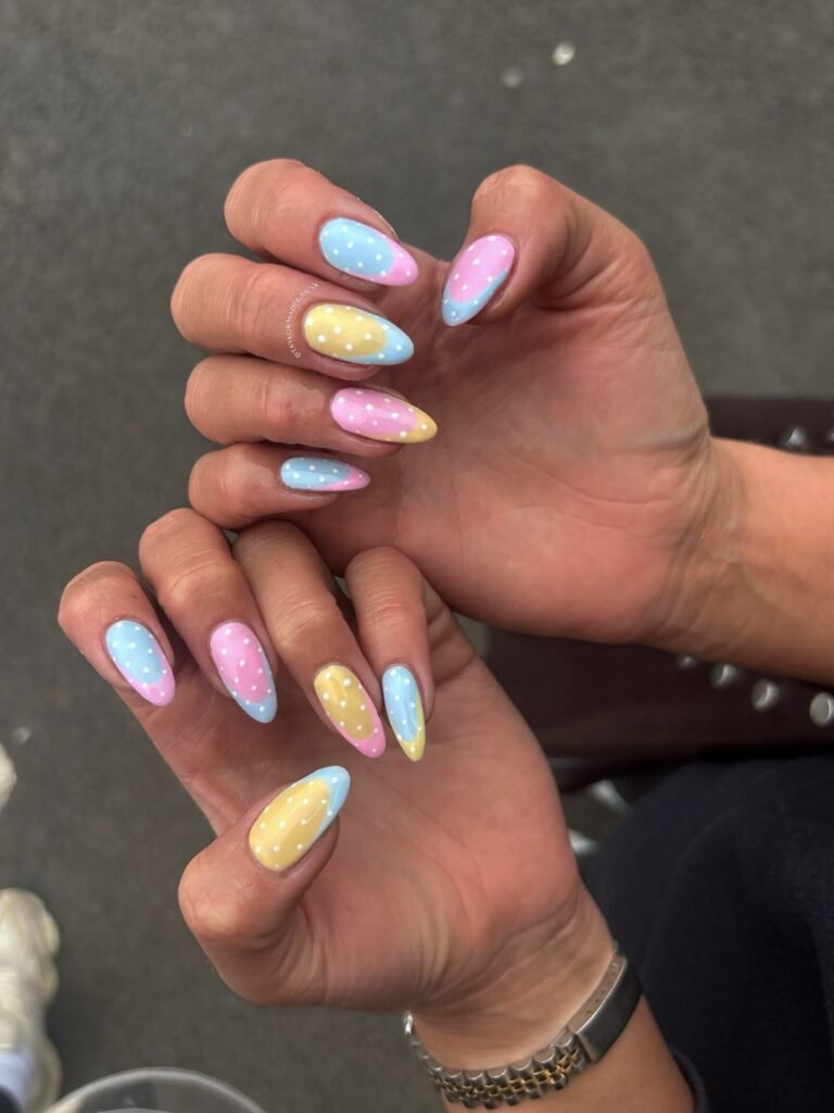 Soft pastel color blocking and tiny white polka dots make this manicure feel playful, sweet, and instantly pin-worthy. The almond shape keeps the look elegant, while the baby blue, blush pink, and buttery yellow palette gives total spring picnic energy. If you love cute nails that still feel polished, this design is perfect for brunch dates, weekend selfies, and anyone building a cheerful seasonal beauty board.