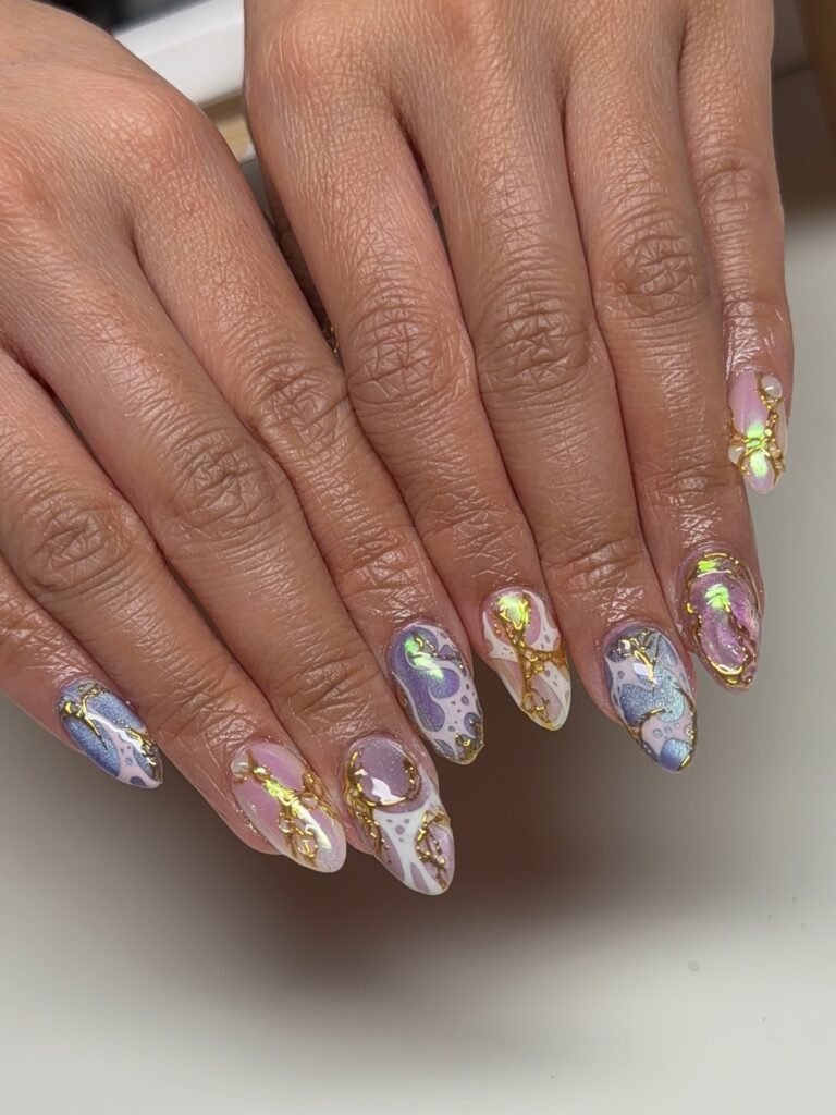 This dreamy set blends iridescent shimmer, pastel swirls, and molten gold lines for a manicure that feels like jewelry for your hands. Lavender, blush, pearl white, and icy blue tones reflect light beautifully, making every angle photo-ready. It is bold but still delicate, which is why it works so well for Pinterest trend boards. Save it for special occasions, vacations, or your next statement salon appointment.