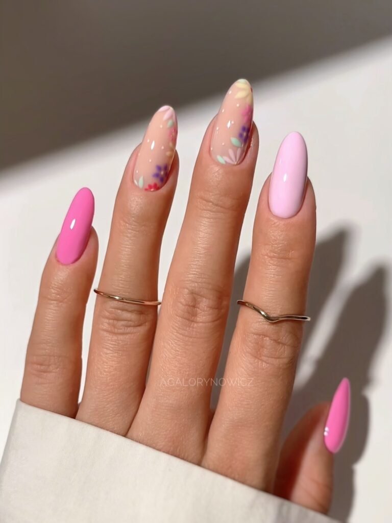 This pink floral set is the definition of soft-girl glam. Bright candy pink and pale blush nails create a clean contrast, while the sheer floral accent nails add delicate, romantic detail without feeling overdone. The glossy finish makes everything look extra fresh in sunlight. Save this idea if you want a feminine manicure that works beautifully for spring, date nights, bridal showers, or everyday polished style.