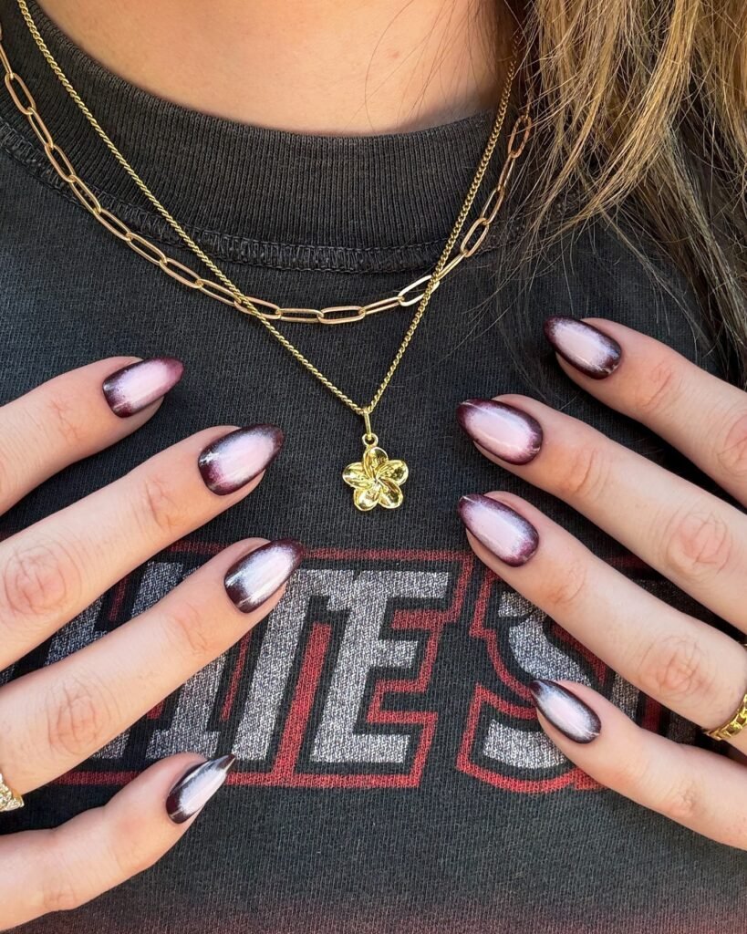 Chrome aura nails are having a major moment, and this smoky plum version feels especially chic. The metallic fade creates depth and edge, while the almond shape keeps the overall look sleek and flattering. Styled with layered gold jewelry, the manicure gives cool-girl energy without trying too hard. Save this for fall, night-out glam, or anytime you want a moody nail look that still photographs beautifully.