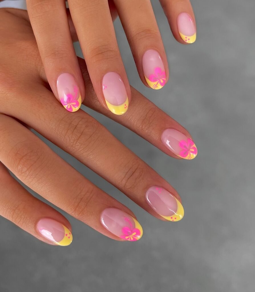This dreamy floral manicure pairs a sheer pink base with buttery yellow French tips and bright pink blooms for the cutest summer vibe. It feels fresh, playful, and easy to wear, making it perfect for beach trips, brunch dates, or vacation photos. Save this nail idea if you love soft neon details that still look polished, feminine, and totally made for your Pinterest board.