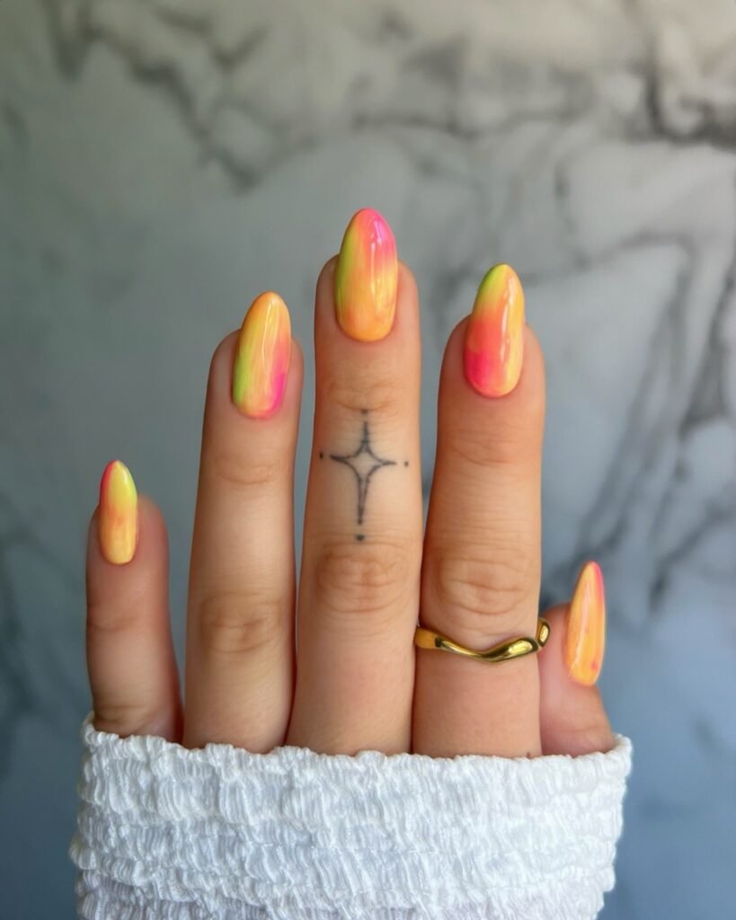 These sunset inspired neon nails glow with soft blends of yellow, peach, pink, and green for a dreamy summer finish. The smooth ombre effect gives this manicure a warm, radiant look that feels made for golden hour selfies, tropical vacations, and rooftop evenings. Pin this style if you want bright nails that stay elegant, eye-catching, and easy to match with your favorite summer outfits.