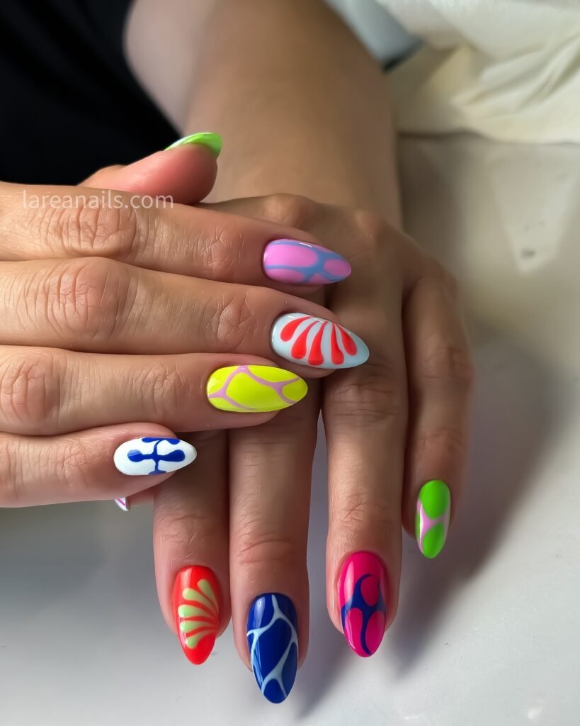 This colorful abstract manicure is perfect for Pinterest lovers who want every nail to feel like tiny modern art. With neon pink, lime, blue, red, and white details, the mixed patterns create a fun, unexpected finish that instantly grabs attention. It is bold, creative, and ideal for statement summer looks. Save this design for a playful manicure that sparks compliments everywhere you go.