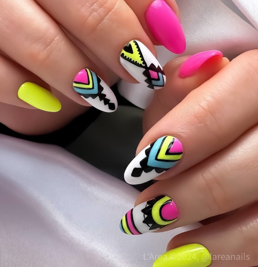 This bold neon nail design mixes hot pink, lime, turquoise, black, and crisp white for a retro statement manicure that instantly stands out. The graphic shapes give it an artsy feel that is perfect for festivals, parties, or content days when you want extra attention. Pin this look for a fearless summer nail idea that turns every outfit into a bright, stylish moment.