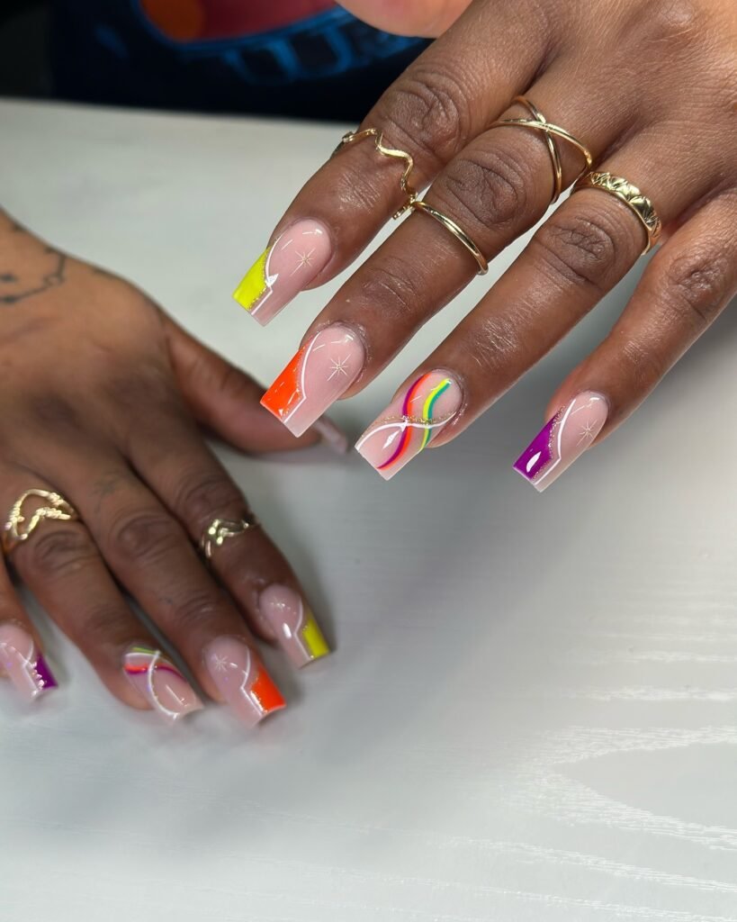 This neon French tip set takes classic nude nails to a whole new level with bright color blocking, sleek curves, and delicate shimmer accents. The mix of yellow, orange, purple, and rainbow details makes this manicure feel glamorous, trendy, and perfect for special events or summer nights out. Save this design if you want a polished nail look with bold personality and serious Pinterest appeal.