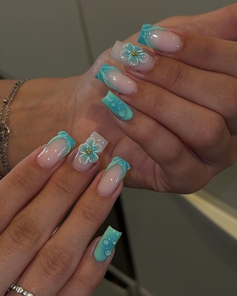 Fresh Aqua French with 3D Florals