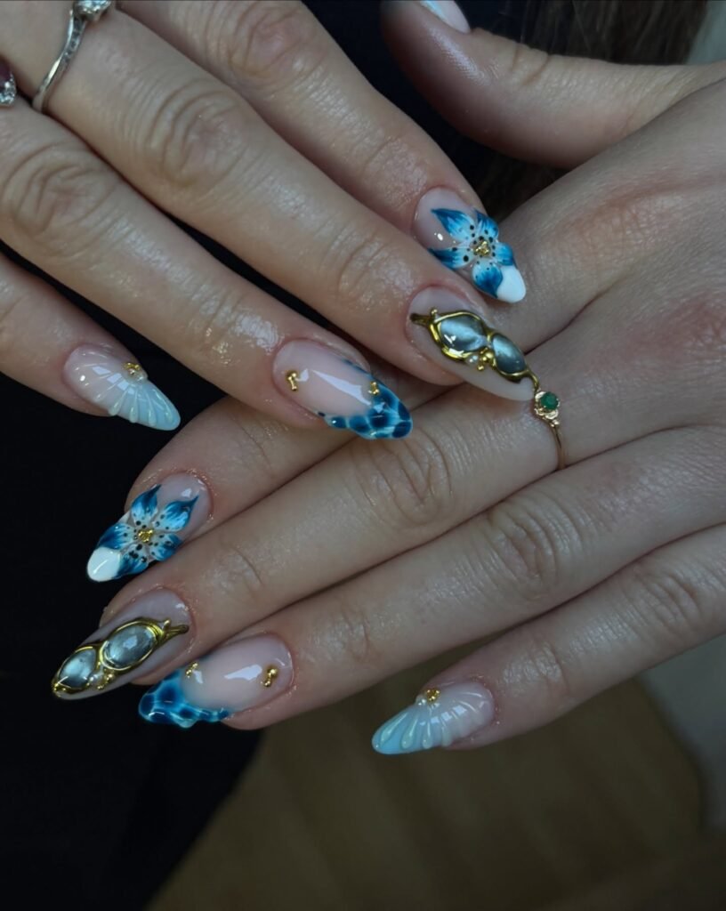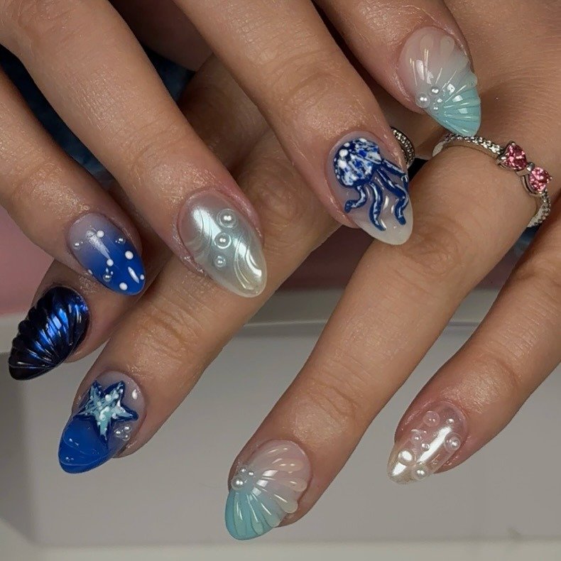 Blue lagoon nails like these instantly bring ocean energy to your summer style. The mix of floral accents, shell-like shapes, glossy neutrals, and deep blue details gives the manicure a playful but refined look. This is the kind of design that performs well on Pinterest because it feels both artistic and wearable for everyday warm-weather outfits and photos too beautifully.