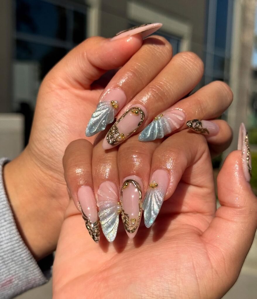 If you love glamorous beach nails, this iridescent design is a must-save. The mix of silver shimmer, sea-blue gradients, and sculpted details creates a mermaid-like finish that looks expensive and artistic. It is a great choice for anyone who wants a statement manicure that still feels tied to the ocean, summer light, and Pinterest-worthy coastal elegance for special occasions too.