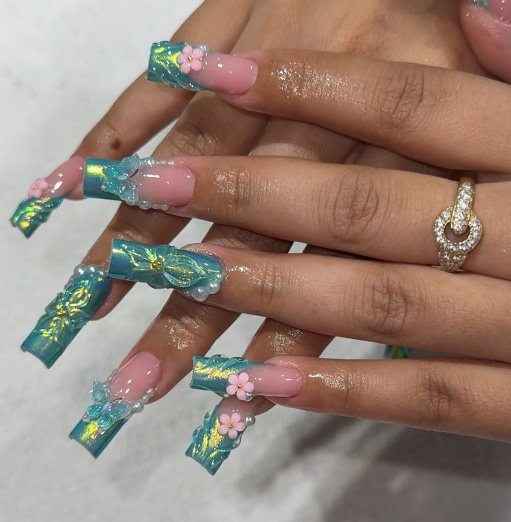 These pastel aqua and pink beach nails are made for girls who love a softer, more whimsical summer look. The long square shape, glossy finish, and tiny floral and butterfly accents create a dreamy, romantic vibe. This manicure is especially Pinterest-friendly because it mixes playful color with elegant structure, making it easy to save and recreate later this season at home.