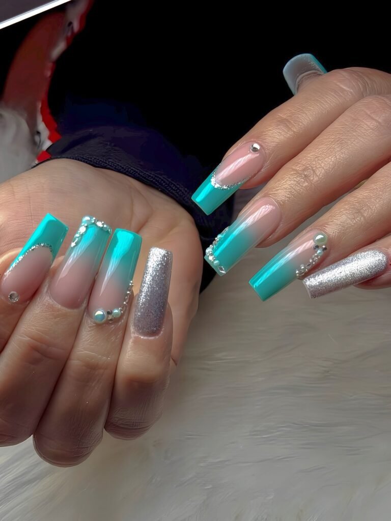 These teal tropical beach nails combine ocean blues, soft seafoam tones, and delicate 3D floral accents for a fresh vacation look. The pointed shape adds drama, while the glitter details keep the design bright and eye-catching. This style is perfect for Pinterest users searching for summer nails that feel polished, artistic, and inspired by clear water and tropical getaways.
