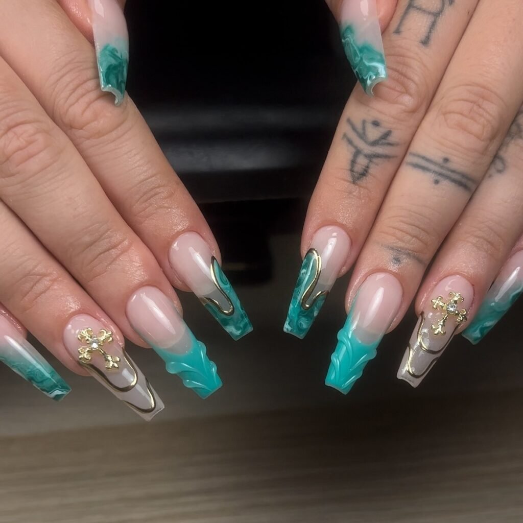 These teal marble beach nails are all about luxury with a coastal edge. The translucent color, glossy finish, and gold framing details create a polished look that feels both modern and elegant. If you want summer nails that stand out on Pinterest without being overly busy, this design is a beautiful choice for long nails and special outings or events too.
