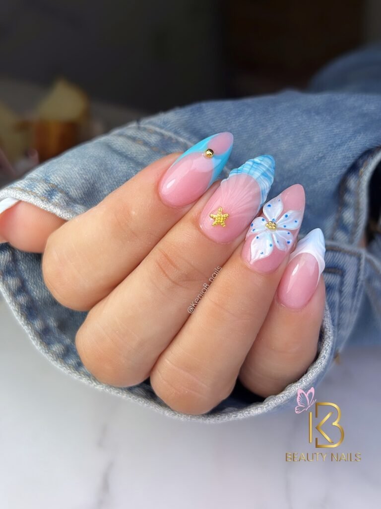 This final beach nail set is a true summer mood board in manicure form. The pastel blue gradients, glossy nude base, and dainty floral accents create a soft coastal finish that feels fresh and feminine. It is the kind of look that fits perfectly on Pinterest because it feels pretty, wearable, and inspiring for anyone planning their next vacation manicure.