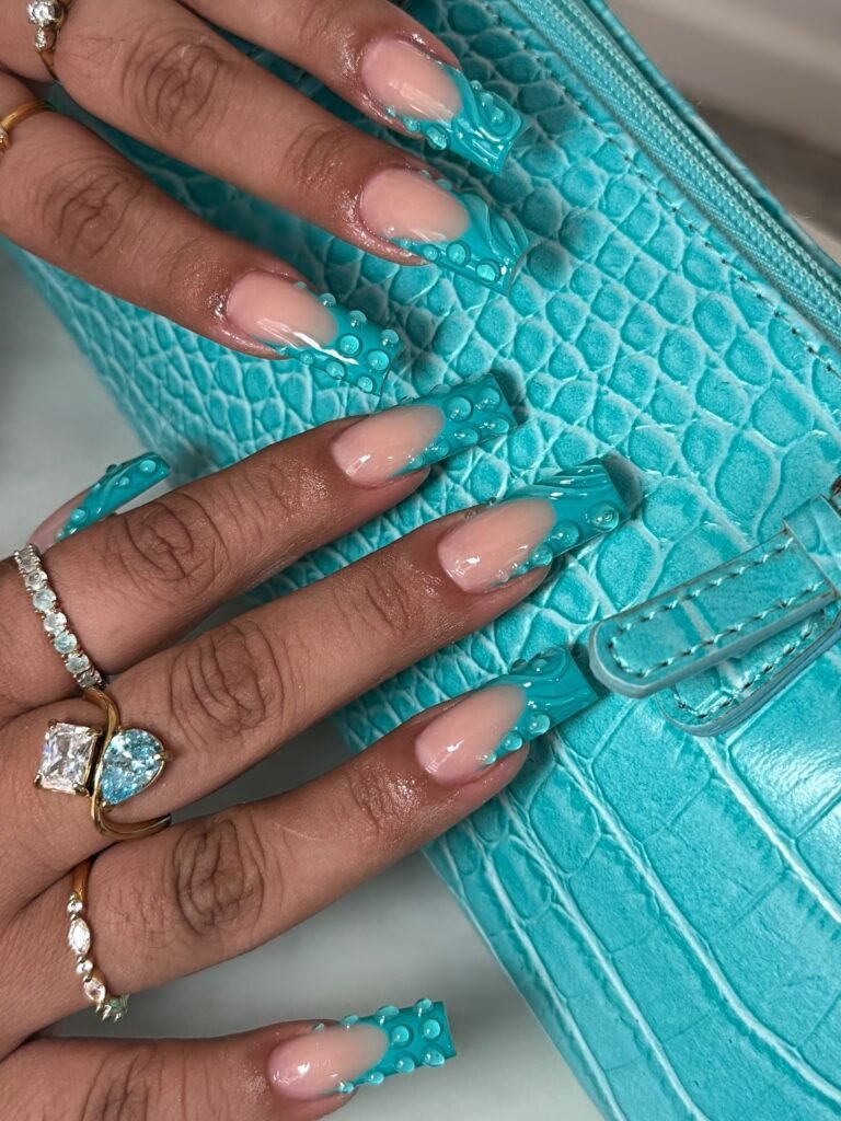 This aqua bubble French manicure is a modern take on classic beach nails. The clear base keeps the style light and fresh, while the turquoise tips and raised bubble details make it feel playful and trendy. Pairing it with a matching textured accessory only boosts the Pinterest appeal, making this look perfect for summer content, vacation photos, and nail inspo saves.