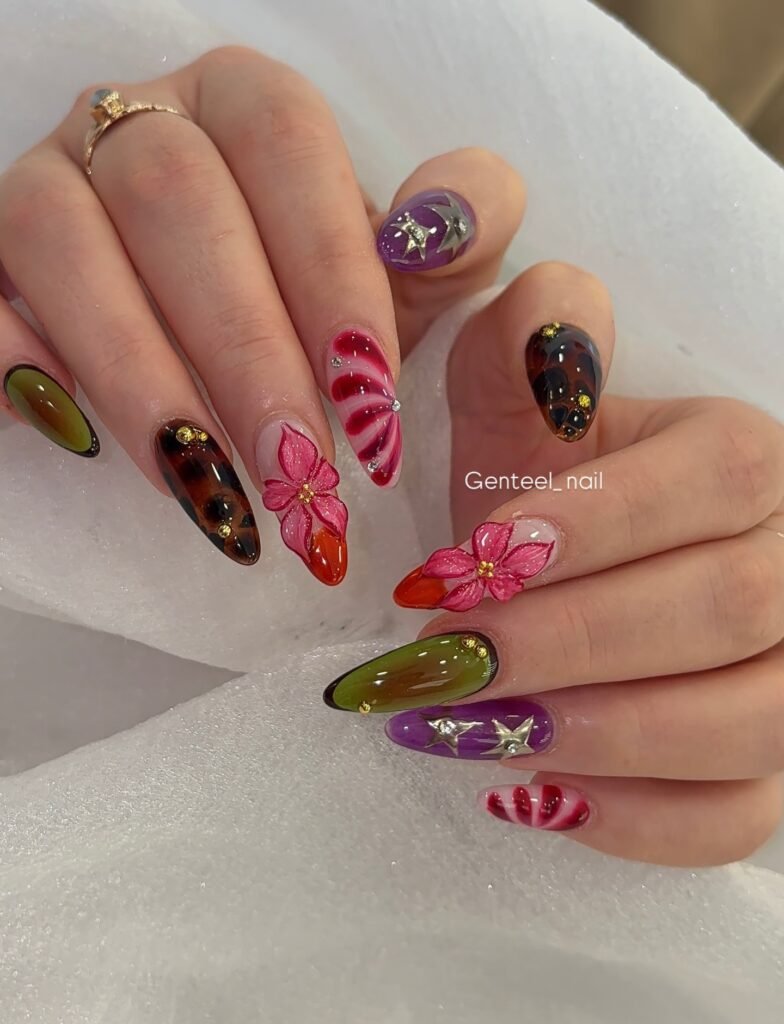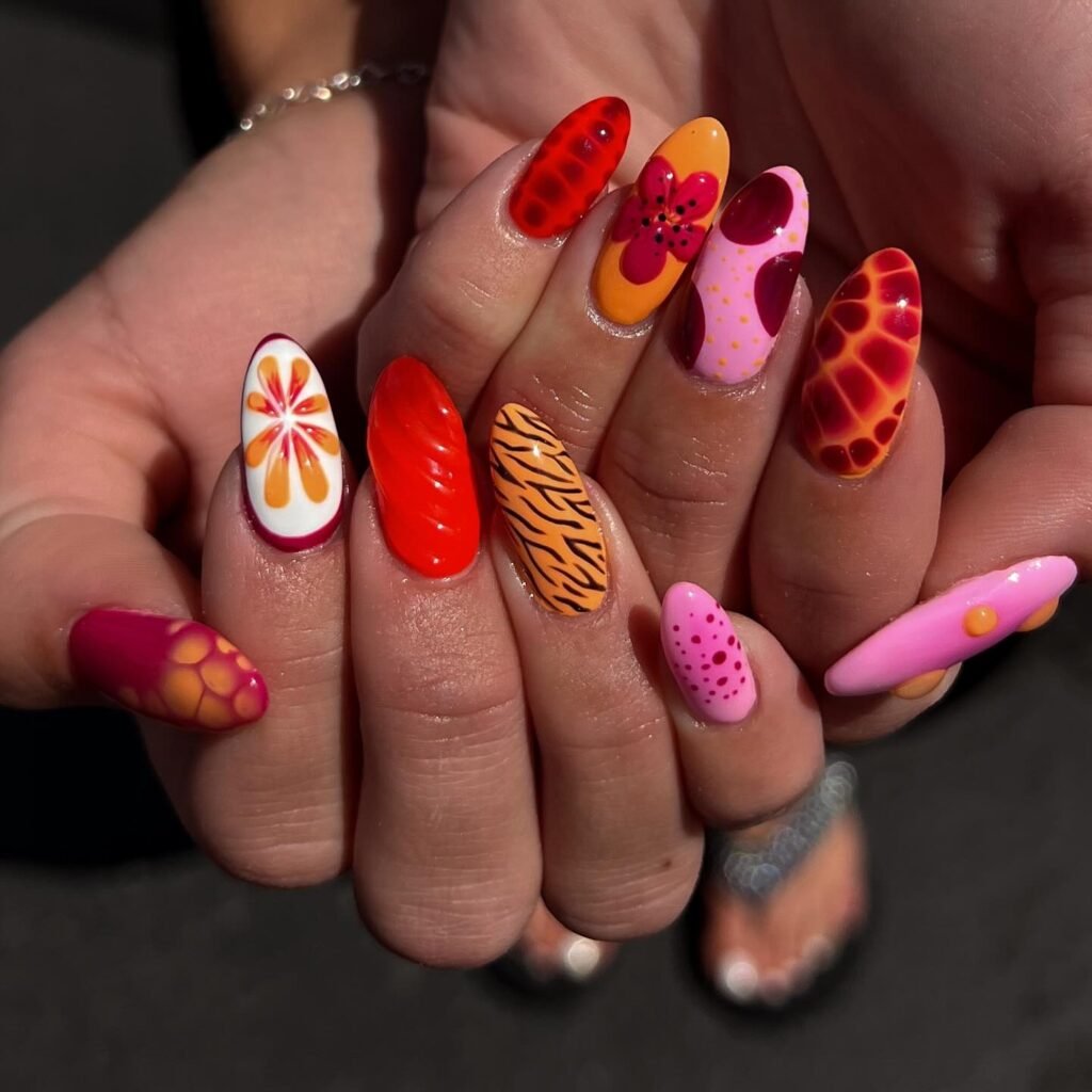 Warm orange, red, and pink tones make this mix and match manicure feel playful, retro, and completely unforgettable. From flower petals and polka dots to tiger stripes and abstract bubble textures, every nail brings a different personality to the set. The almond shape keeps everything sleek and flattering. If your nail mood board is full of bold color stories, this is the kind of artistic manicure worth copying.