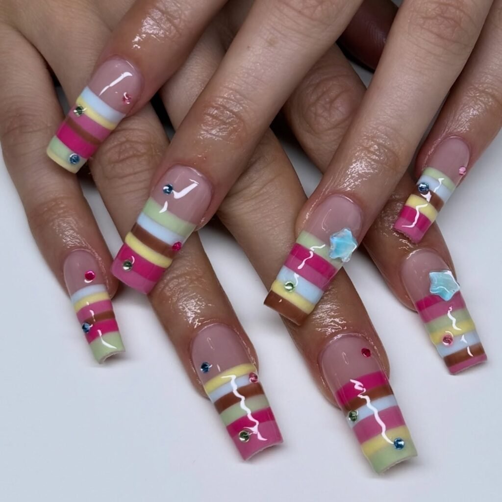 If cute pastel French tips are your thing, this square set gives them a fresh mix and match update. Soft stripes in pink, yellow, mint, white, and brown create a candy-like finish, while tiny gems and translucent blue star charms add extra personality. It feels playful without losing structure. Save this design if you want colorful acrylic nails that look sweet, glossy, and detailed.