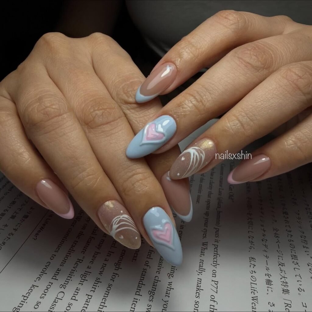 This soft blue and nude manicure is a dreamy choice if you want to mix and match nails that still feel elegant. Glossy neutral nails, baby blue French tips, tiny heart details, and shimmering swirl accents create a romantic look without feeling too busy. The palette is gentle and versatile, making it perfect for everyday wear. It’s a lovely save for minimalist nail lovers who want subtle charm.