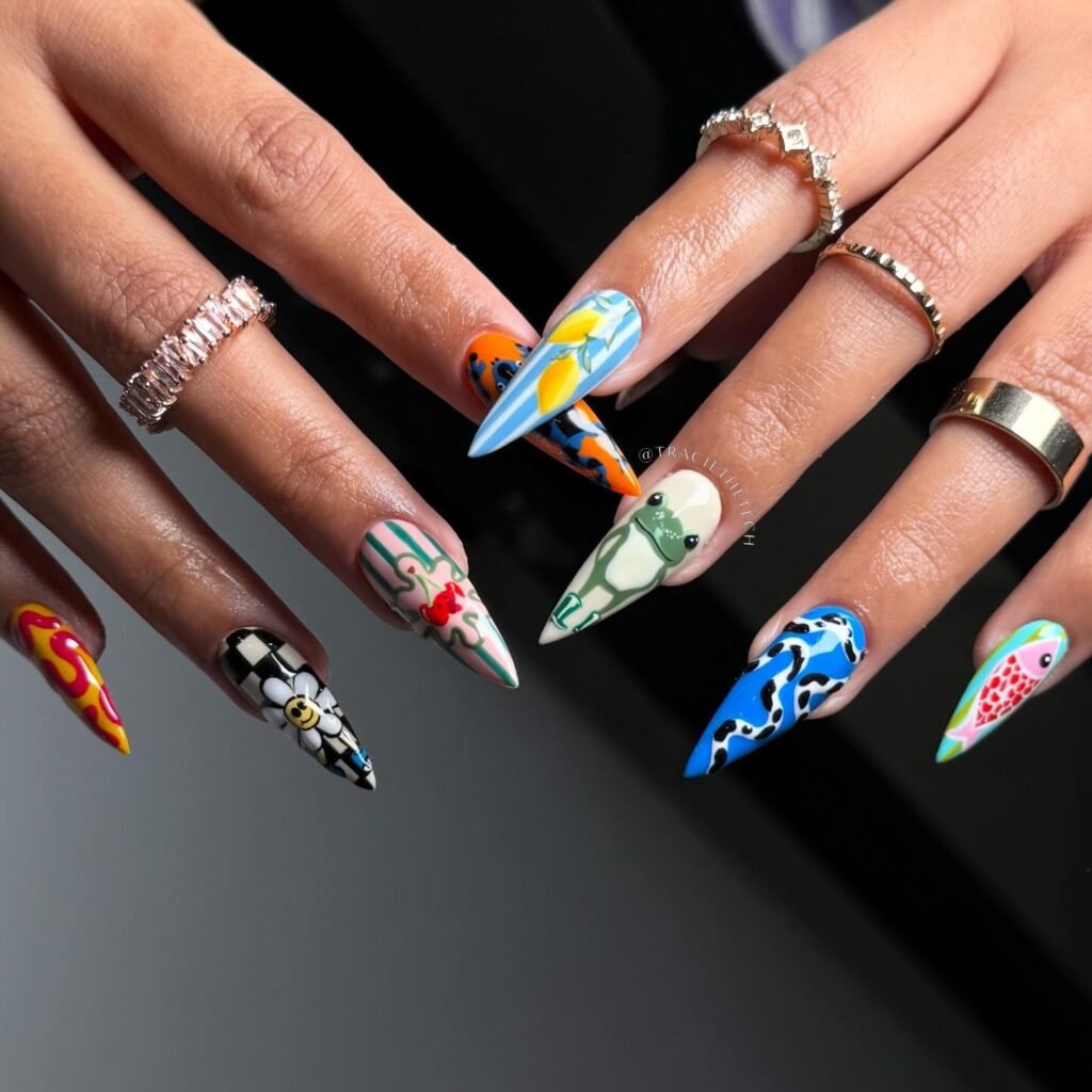 This eclectic nail set is perfect for anyone who wants true mix and match art with zero rules. Flames, checkerboard flowers, cherries, a frog, lemons, blue waves, and a bright fish all share the same bold, graphic energy. The long pointed shape makes every detail pop even more. If you love quirky, conversation-starting nails, this manicure is a Pinterest board all by itself.