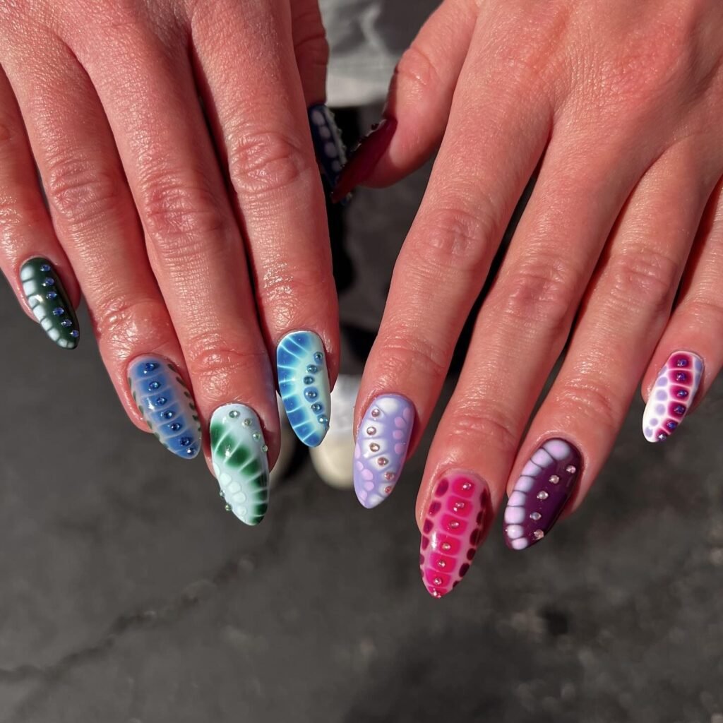 This colorful airbrushed set proves mix and match nails can feel both futuristic and soft. Blue, green, lilac, purple, and hot pink gradients blend with dotted patterns and tiny rhinestone details for a glossy, dimensional finish. Every nail looks like wearable art, especially in sunlight. If you love statement manicures that photograph beautifully for Pinterest, this design is one you will definitely want to pin.