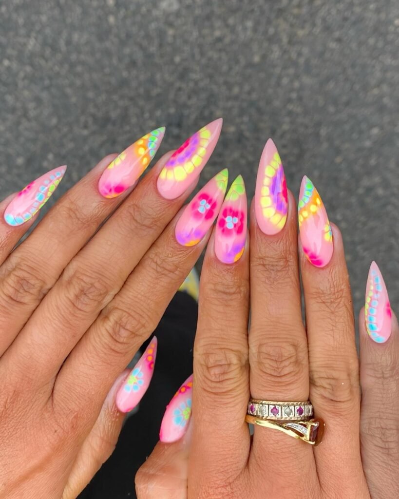 These neon butterfly-inspired nails are pure Pinterest energy. The soft pink base gives the design a dreamy starting point, while electric pops of yellow, green, blue, and purple create a glowing stained-glass effect. Each nail feels different, but the set still looks cohesive and intentional. If you love bright mix and match nails for spring or summer, this manicure is a fun way to wear color without holding back.