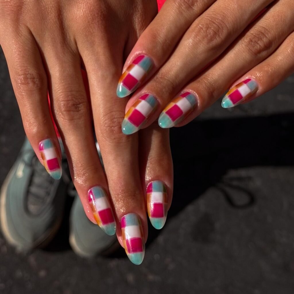 For a cleaner take on mix and match nails, this geometric pastel set is such a pretty option. The soft aqua, white, pink, and caramel blocks create a modern checkered effect that feels minimal yet eye-catching. Because the palette stays consistent, the design looks balanced instead of busy. This is perfect for anyone who loves trendy nail art that still feels polished, wearable, and easy to style.
