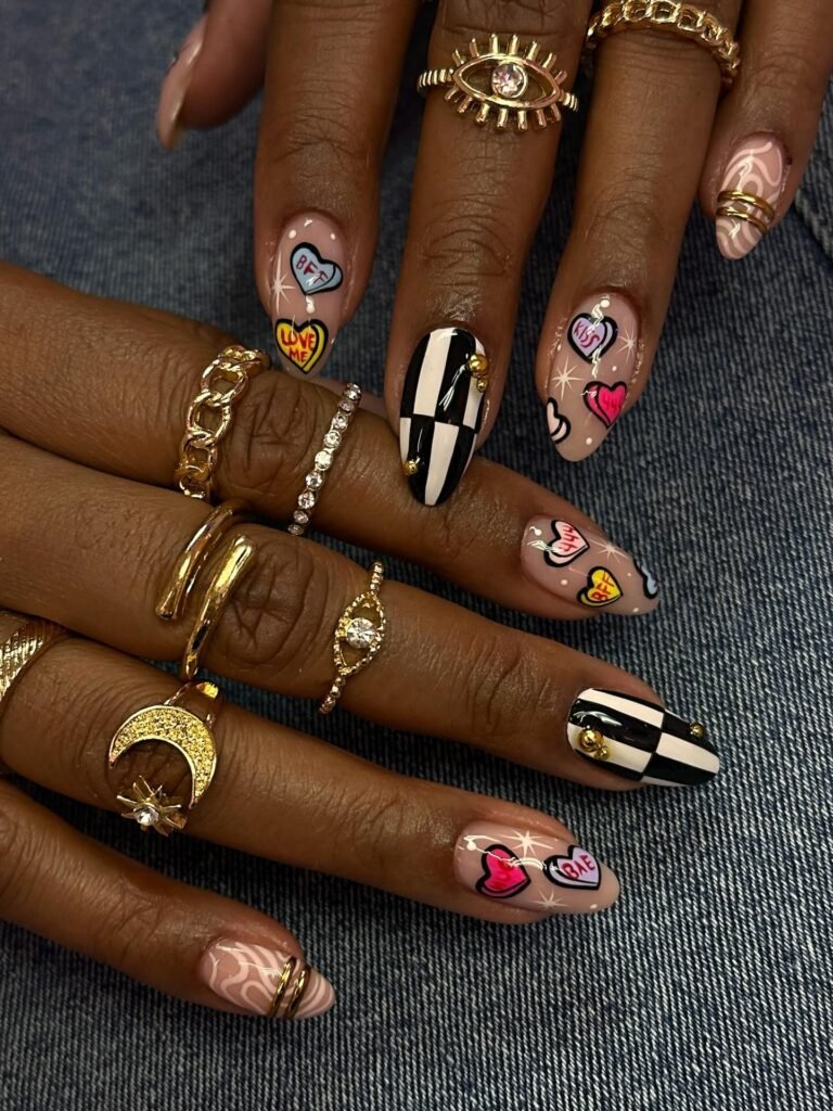 This mix and match manicure is made for anyone who loves playful nail art with attitude. The nude base keeps the look polished, while candy-heart graphics, checkerboard accents, and soft swirl details add a bold, fashion-forward twist. Gold rings make the whole set feel even more elevated. If you want Valentine-inspired nails that still feel edgy and trendy, this is a perfect screenshot for your next salon visit.