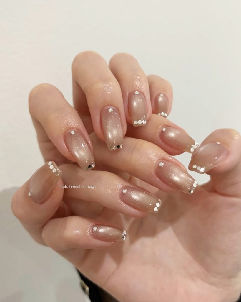 Minimal but still glamorous, this nude holographic French manicure proves that tiny rhinestones can make a huge impact. The soft taupe shimmer base feels clean and polished, while the crystal-tipped edges add subtle sparkle that works for everyday wear or special occasions. This look is perfect for anyone who loves classy nails with a modern twist. Save this pin for an understated rhinestone nail inspo that still feels elevated.