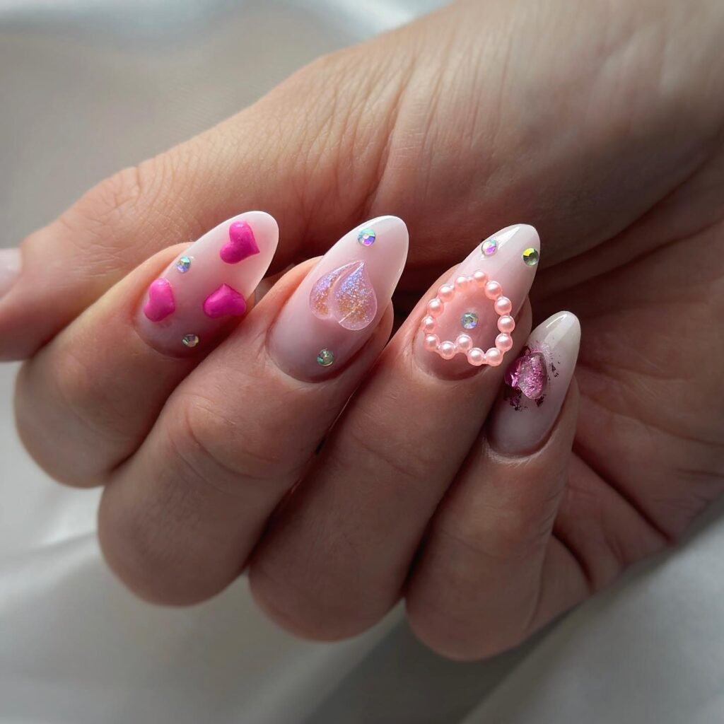 Sweet and playful with just the right amount of sparkle, this pink 3D nail set is perfect for coquette-inspired beauty lovers. Raised hearts, pearl details, glitter accents, and tiny rhinestones turn a soft milky base into a dreamy statement manicure. It’s cute, feminine, and ideal for Valentine’s Day, birthdays, or everyday girly glam. Pin this design if you love romantic nails that feel fun, trendy, and photo-ready.