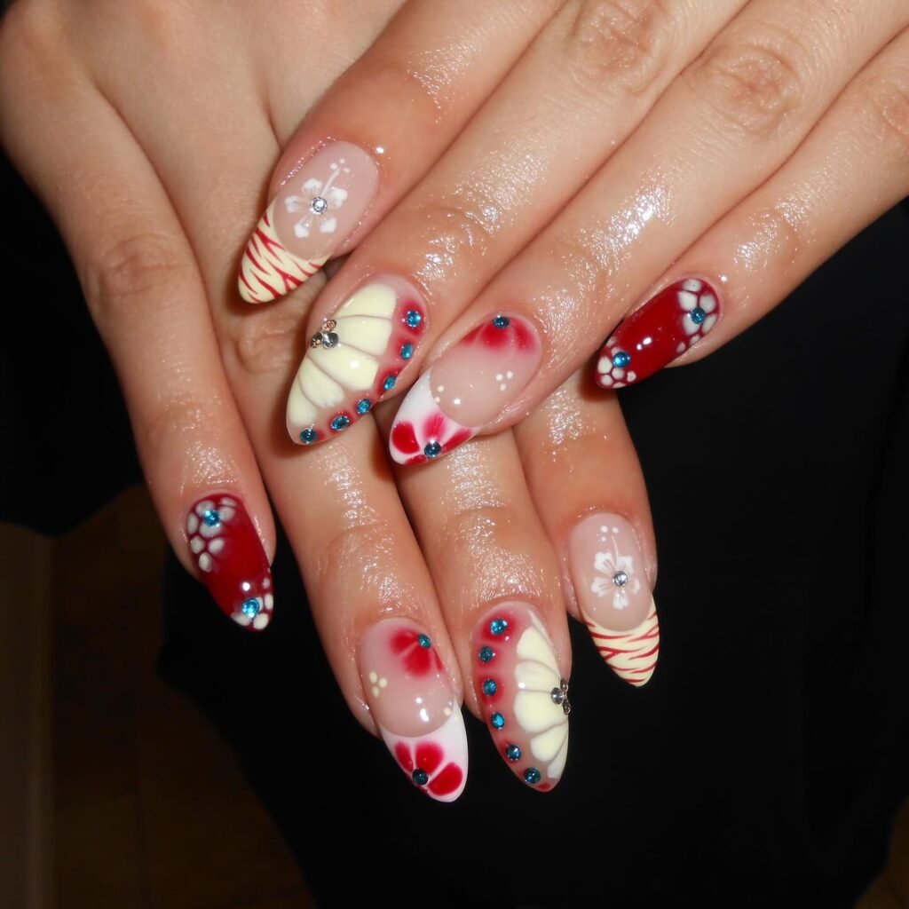 Bright, playful, and full of retro charm, this red and white nail design is made to stand out. Floral accents, zebra-inspired lines, soft ombré details, and bold blue rhinestones create a fun mixed-art look that feels fresh and unique. Perfect for summer, festivals, or statement manicure lovers, this set brings color and personality to every fingertip. Save this pin for cute rhinestone nails with a trendy, artsy vibe.