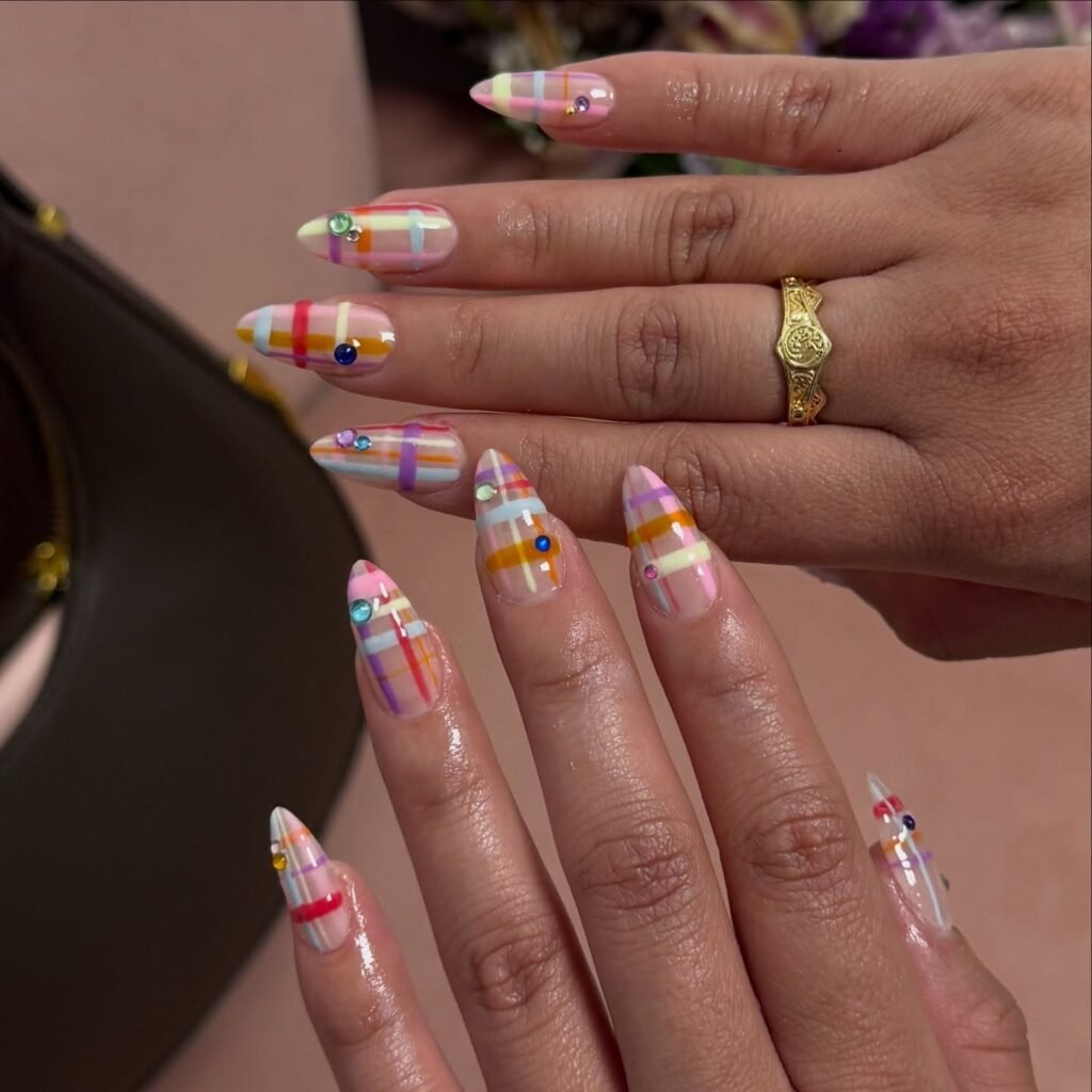 This playful plaid nail design is the perfect mix of soft pastels and bold sparkle. Sheer nude bases let the colorful crisscross lines stand out, while tiny rhinestones add just enough glam for a Pinterest-worthy finish. Ideal for spring, brunch dates, or fun vacation nails, this almond set feels fresh, trendy, and creative. Pin this look if you want cute rhinestone nails with a modern artsy twist.