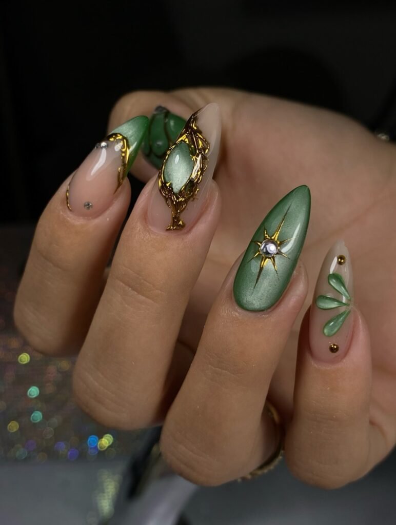 This emerald green manicure brings luxe energy with metallic shine, gold framing, and delicate rhinestone accents. The mix of nude negative space and rich chrome-like color creates a statement look that feels elegant, mystical, and fashion-forward. Perfect for fall, holiday parties, or anyone who loves bold nail art, this almond set is pure glam. Save this design if you want classy green nails with high-end detail and sparkle.