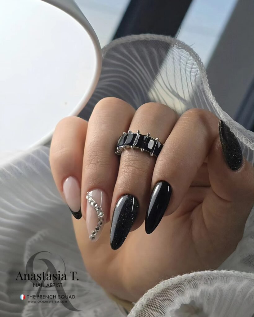 If you love dramatic nails with a sophisticated edge, this black and nude rhinestone set is a must-save. Glossy black polish, glittery accents, and a crystal wave detail create the ultimate evening manicure. The pointed shape makes the look extra sleek, while the nude base balances the bold contrast beautifully. Perfect for winter events, formal outfits, or date night, these glam nails feel timeless and confidently chic.