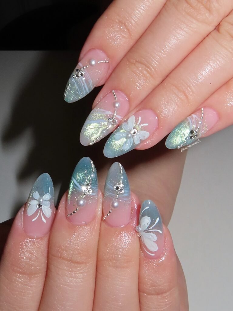 This icy blue rhinestone manicure is dreamy, delicate, and full of fairycore charm. Soft shimmer tips, hand-painted white flowers, pearls, and crystal accents give this set an ethereal finish that feels perfect for weddings, winter nails, or romantic occasions. The almond shape keeps everything elegant, while the sparkle catches light beautifully. Pin this look if you love feminine nail art that blends floral details with a frosty, luxurious glow.
