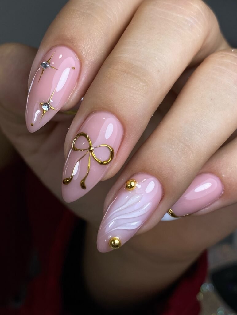 This soft pink rhinestone manicure blends classy and cute with delicate gold detailing, tiny crystal accents, and a charming bow design. Perfect for bridal showers, date nights, or feminine everyday glam, this look feels polished without being too bold. The almond shape adds elegance, while the glossy nude-pink base keeps it timeless. Save this nail inspo if you love chic, romantic manicure ideas with luxury touches.