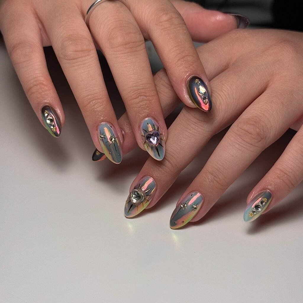 This iridescent chrome nail set is pure futuristic glam. With mirror-like shine, celestial starburst details, and oversized crystal hearts, the design feels bold, edgy, and totally Pinterest-worthy. The soft pastel reflects shifts beautifully in the light, making every angle look magical. Ideal for party season, fashion-forward looks, or anyone craving statement nails, this manicure is all about high-impact sparkle. Pin it for glamorous rhinestone nails with cosmic energy.