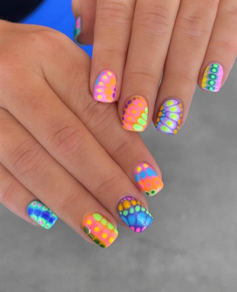 If your Pinterest boards are full of bold summer beauty, this neon swirl and dot manicure is a total must save. The mix of pink, orange, green, purple, and blue creates a playful retro energy that instantly grabs attention. These nails are fun, artsy, and unapologetically bright, making them perfect for vacations, concerts, pool days, or anyone ready to wear color with confidence.