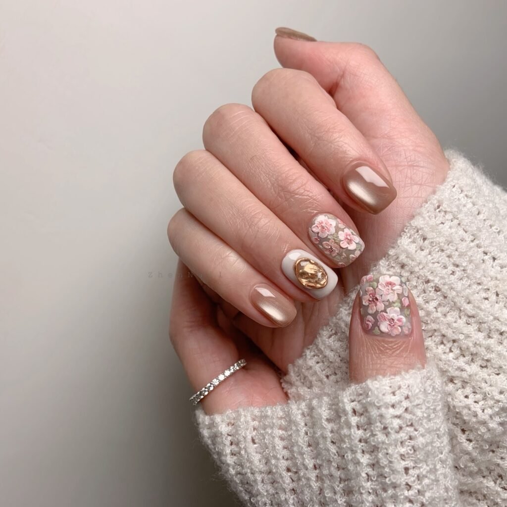 This neutral floral set is perfect for anyone who loves soft luxury and elegant details. The muted taupe chrome nails give a modern glossy finish, while the raised pink flowers and gold accent create a textured, boutique inspired look. It feels cozy, feminine, and elevated all at once, making it a beautiful choice for weddings, special events, or chic everyday nails with a refined mood.