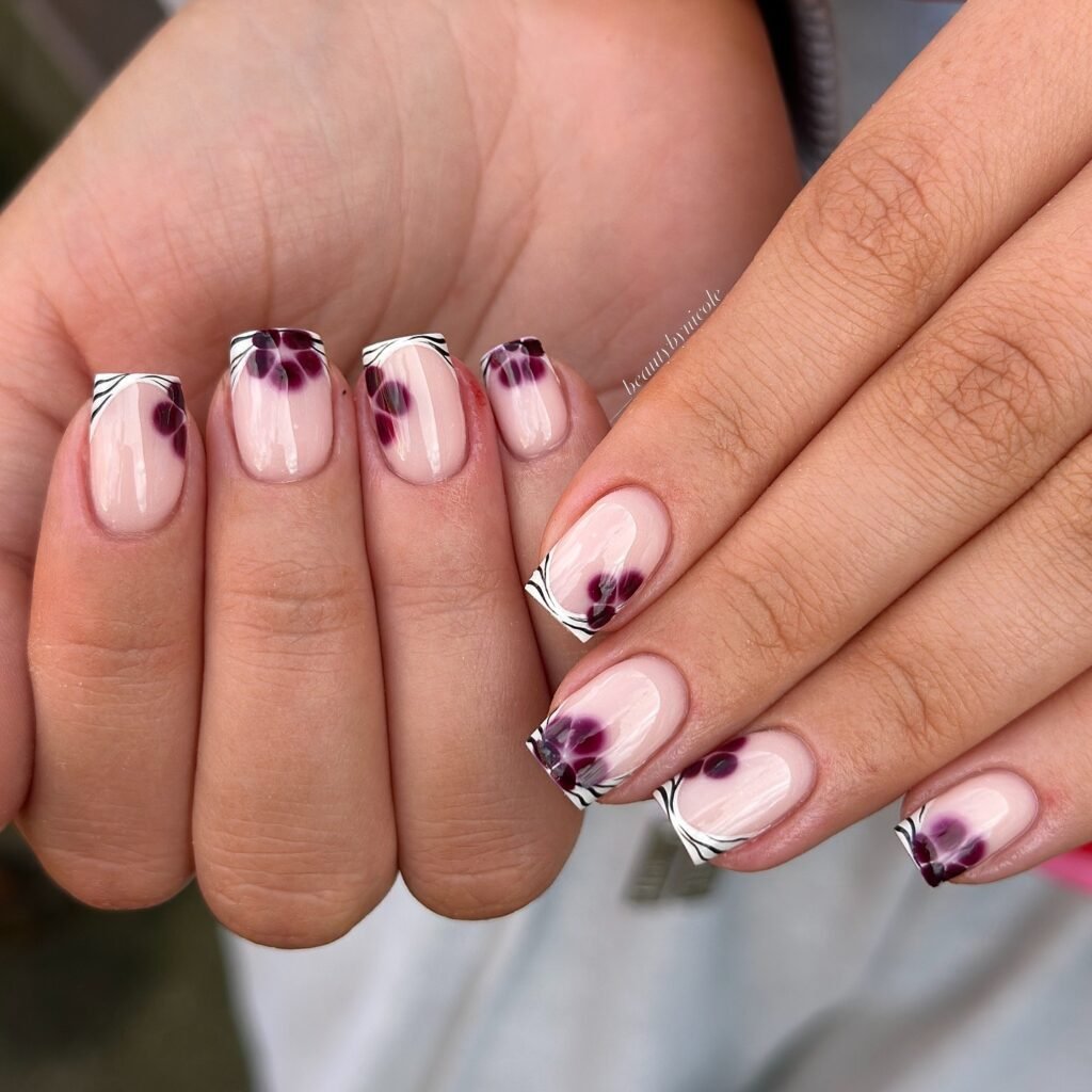 This elegant floral French manicure gives classic nude nails a fresh, artistic update. The soft pink base creates a polished foundation, while the deep plum blooms and fine black curves make the tips feel modern and elevated. If you want a design that works for weddings, dinners, or office days, this chic set proves short square nails can still look refined and statement making.