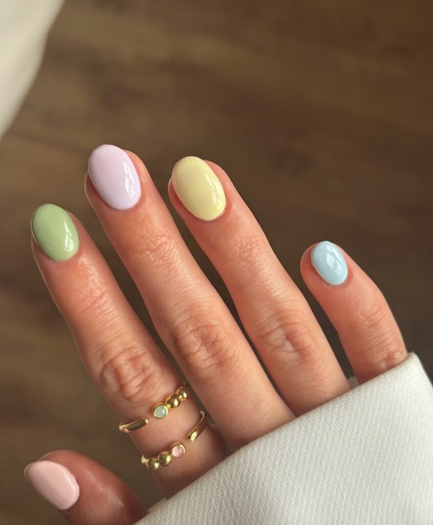 Pastel rainbow nails are a sweet way to wear color without going over the top. This glossy mix of mint, lilac, butter yellow, baby blue, and soft pink feels airy, happy, and perfect for the season. If you want an easy manicure idea that photographs beautifully and suits every outfit, these polished short nails deliver a soft playful finish that Pinterest users always love to save.