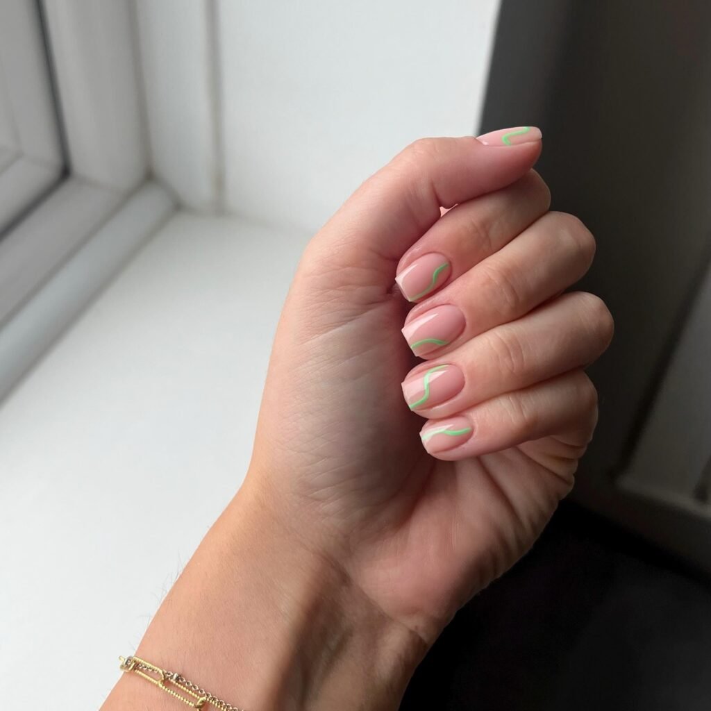 This minimalist nail look is proof that short nails can be modern, chic, and effortlessly stylish. A glossy neutral base paired with thin green wave details creates an understated design that still feels fresh and trend aware. It is perfect for anyone who loves clean beauty, capsule wardrobe vibes, or low maintenance manicures that match everything while still giving a subtle Pinterest inspired twist.