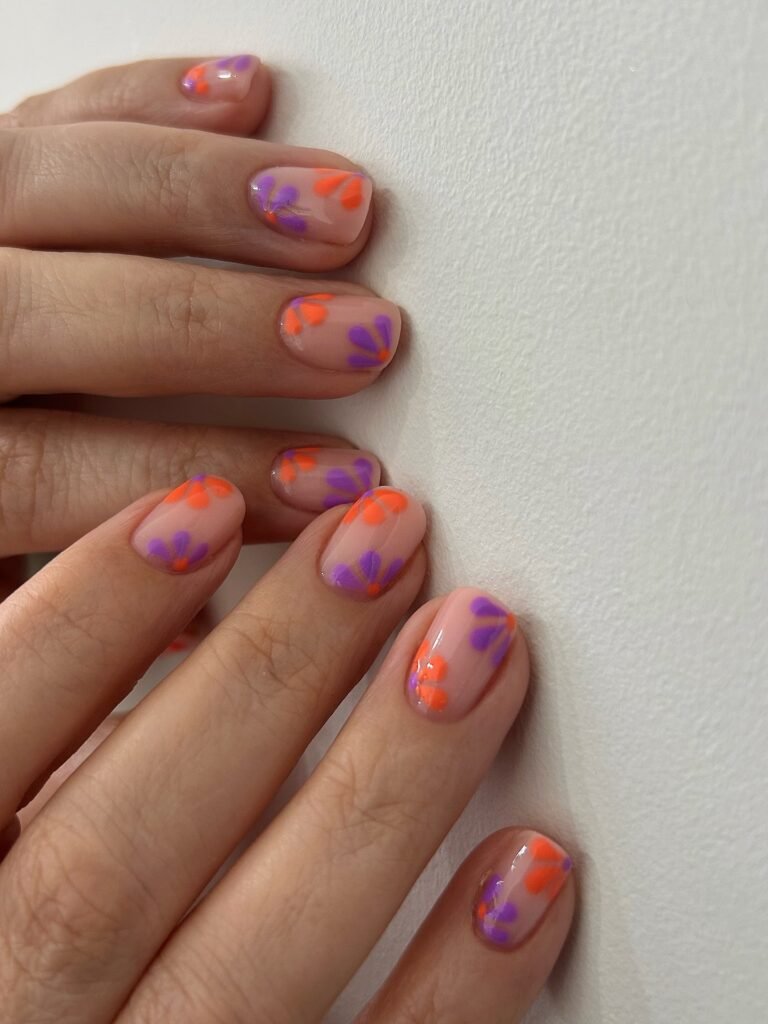 This soft floral manicure is perfect for anyone who wants spring and summer nails that feel playful without looking too busy. The nude pink base keeps the look clean, while the orange and purple petal details add a cheerful pop of color. It is a great choice for short nails, everyday wear, brunch dates, and anyone who loves cute Pinterest worthy floral designs.