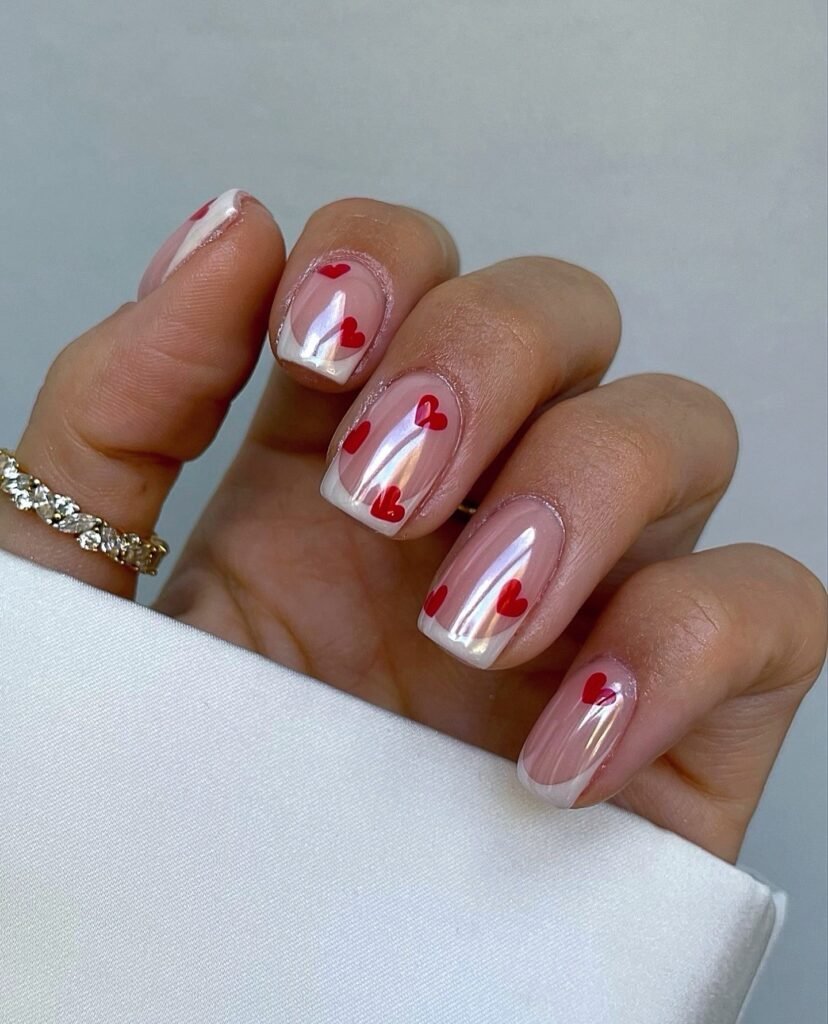 For a cute romantic manicure that still feels clean and wearable, these tiny red hearts on a sheer pink base are such a pretty pick. The crisp white French tips add structure, while the glossy finish keeps the whole design looking fresh and delicate. This is a perfect nail idea for date nights, Valentine season, or anyone who loves subtle details with a flirty twist.