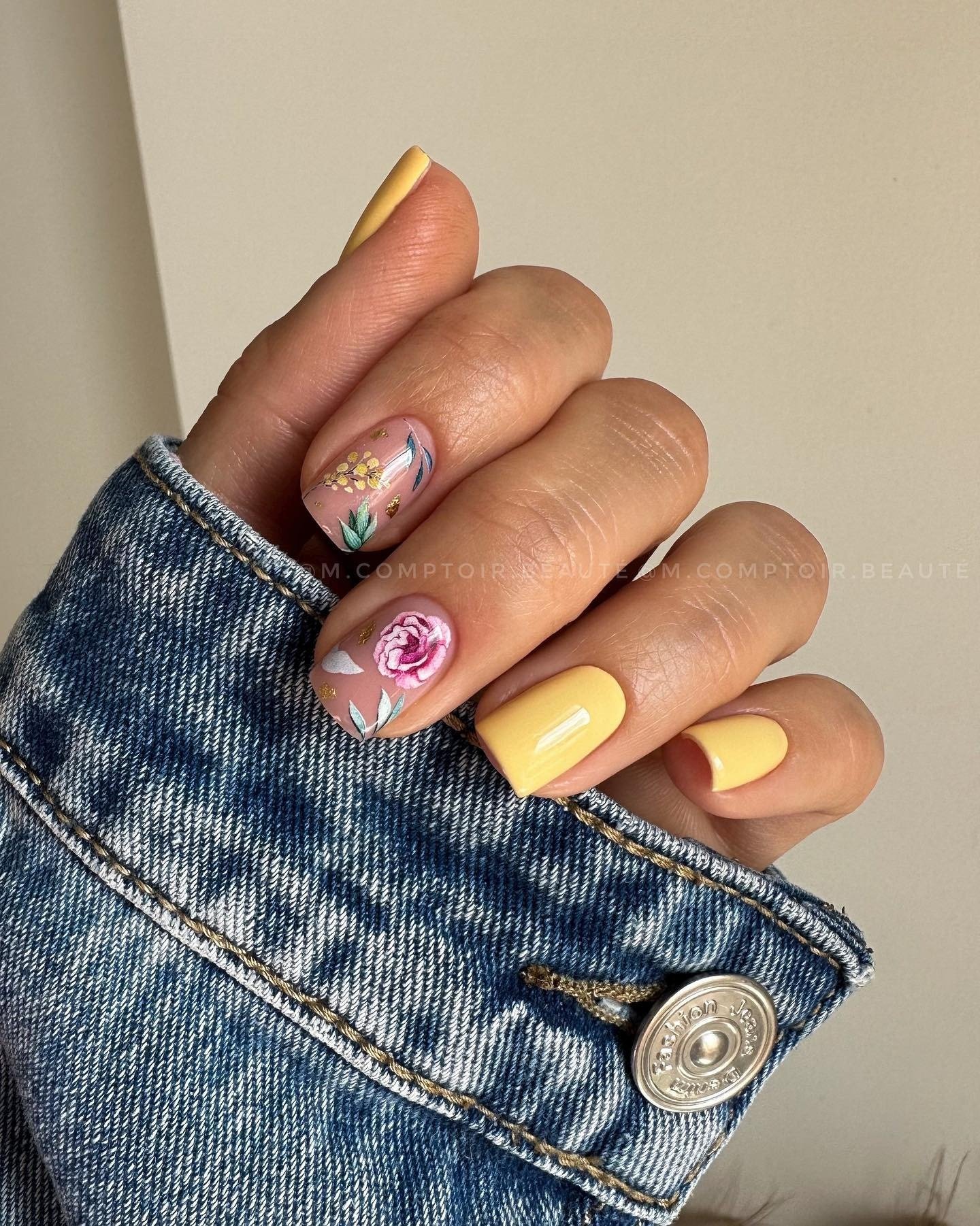 This sunny yellow manicure blends solid color with delicate hand painted florals for a look that feels cheerful and polished at the same time. The soft nude accent nails showcase pretty pink roses, leafy details, and tiny gold touches that make the design feel extra special. It is ideal for spring outfits, garden party vibes, or anyone wanting a short nail set with artistic charm.