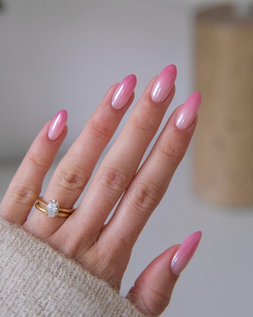 Glossy pink almond nails never go out of style, and this pearly finish makes them feel even more elegant. The soft shimmer catches the light beautifully, giving a clean, feminine look that works for weddings, date nights, or daily wear. If you’re drawn to understated glamour and timeless manicure ideas, this polished pink set is an easy favorite to pin now and recreate again and again.