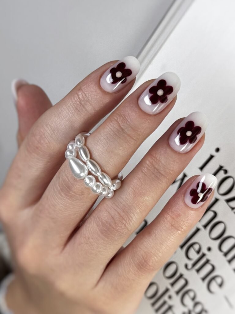 These glossy floral nails bring a retro-inspired vibe in the most elevated way. The rich burgundy flowers pop against the milky white base, creating a sweet but striking design that feels perfect for fall, winter, or year-round statement manis. If you love nail art that is cute, clean, and slightly vintage, this set belongs on your mood board. It’s playful, polished, and wonderfully eye-catching.
