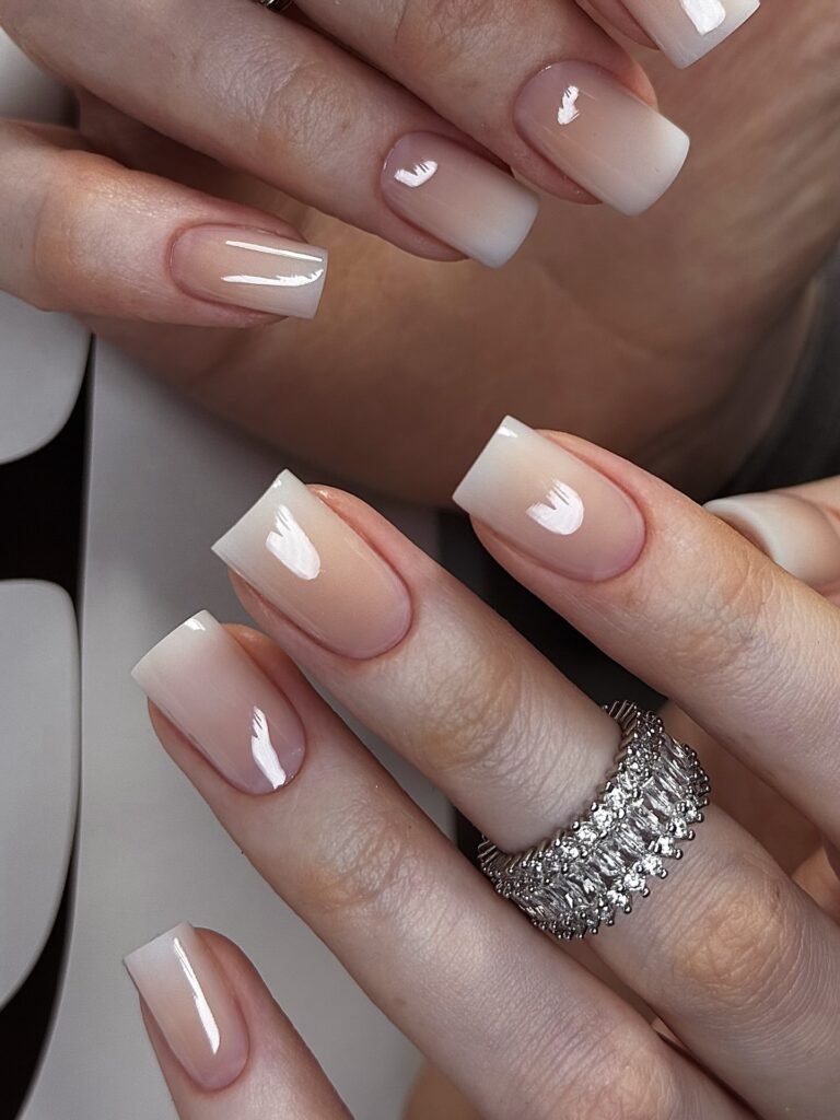 Classic, clean, and endlessly flattering, this nude-to-white ombré manicure is the definition of timeless beauty. The soft fade gives a French-inspired effect without harsh lines, making it ideal for brides, special occasions, or anyone who loves elegant everyday nails. Square tips add structure, while the glossy finish keeps everything modern. If you want a manicure that matches every outfit, this is a pin-worthy staple.