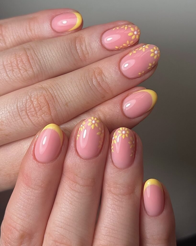Pink Nails with Yellow Tips and Floral Details