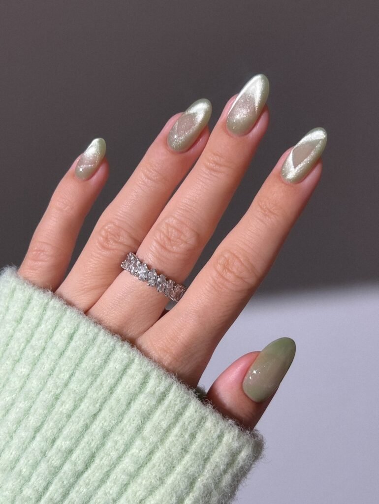 Sage green chrome nails are having a major Pinterest moment, and this shimmering design shows exactly why. The soft metallic finish feels modern, luxe, and a little futuristic, while the negative-space accents keep the set balanced and stylish. This is the kind of manicure that pairs beautifully with cozy knits, gold jewelry, and neutral outfits. Save this look if you want trendy nails that still feel classy and wearable.