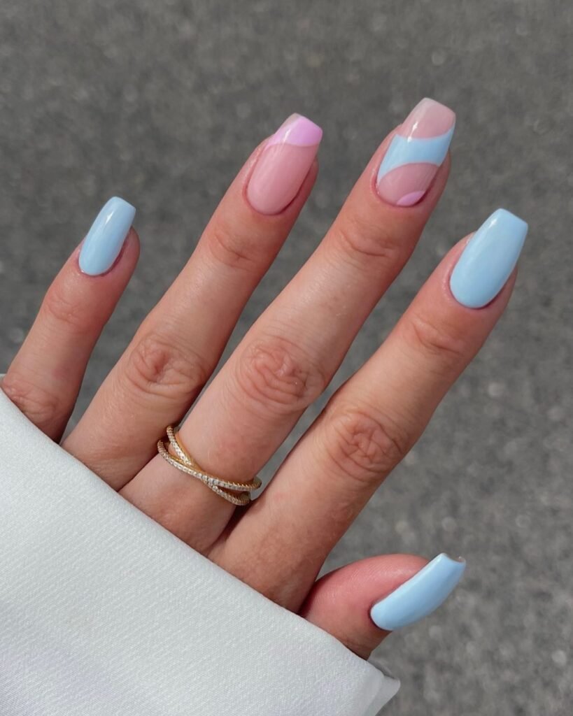 If you love artistic nails, this pastel wave design is a dream. The mix of blush pink, powder blue, and creamy white creates a soft abstract effect that feels modern and feminine. The flowing curves make the manicure look elegant without being too bold. It’s a beautiful choice for anyone who wants trendy nails that still feel gentle, polished, and Pinterest-worthy.