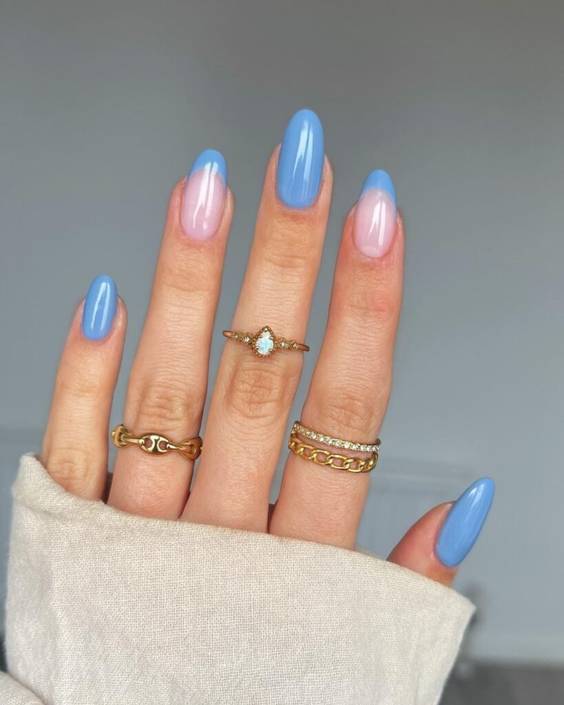 For a softer take on light blue nails, this pearly almond manicure is everything. The milky finish gives each nail a healthy glow, while the baby blue tips add a cool, modern edge. It’s a subtle design that still feels expensive and elegant. If your style leans minimal, polished, and romantic, this is a perfect year-round nail idea.