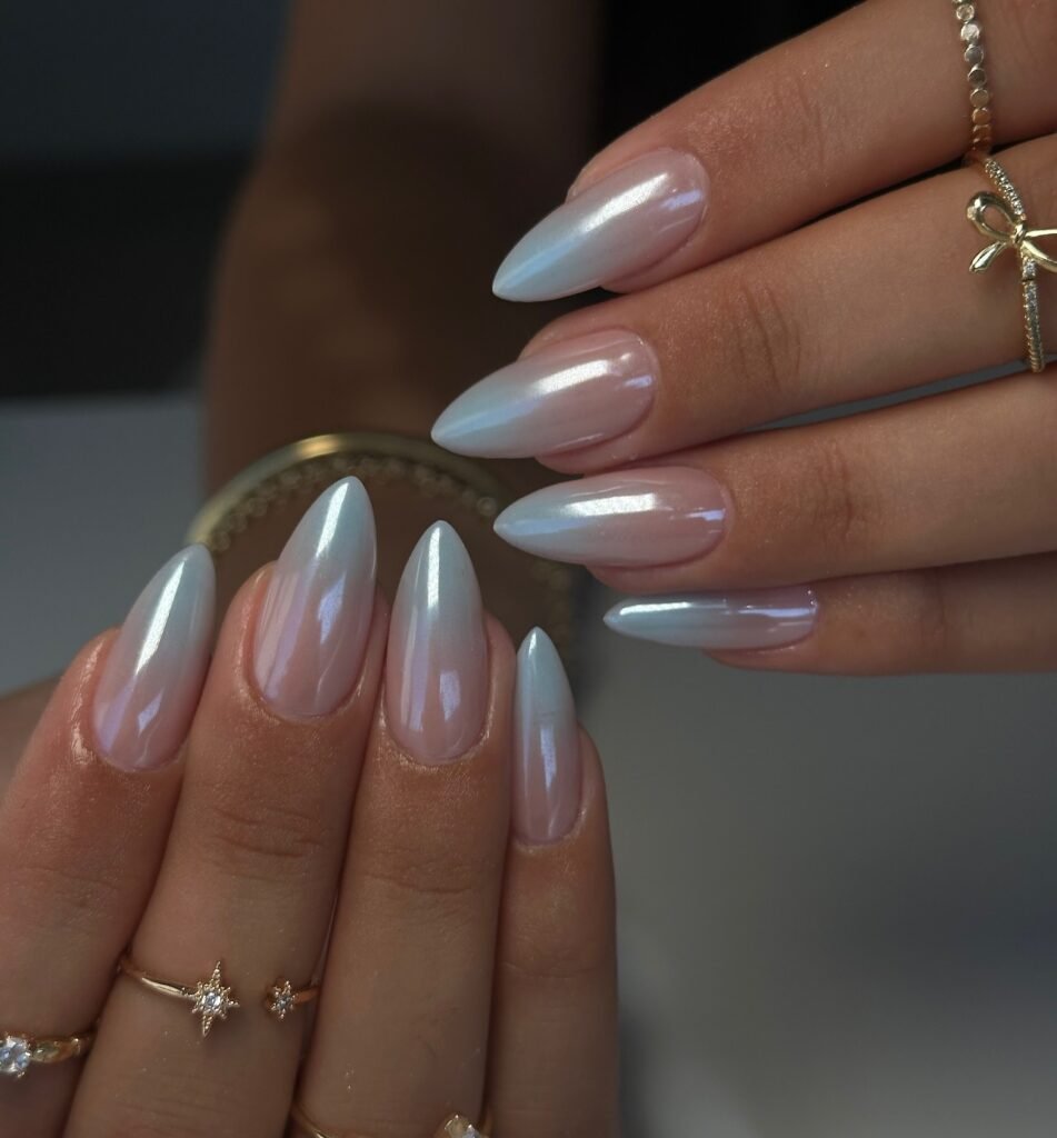 These milky nude nails with icy blue tips create a dreamy, elegant look that feels soft and expensive. The subtle pearl finish adds shine, while the long almond shape keeps the manicure sleek and refined. This style is perfect for Pinterest users who love minimalist nails with a romantic twist. It works beautifully for weddings, brunch dates, or a classy everyday look.